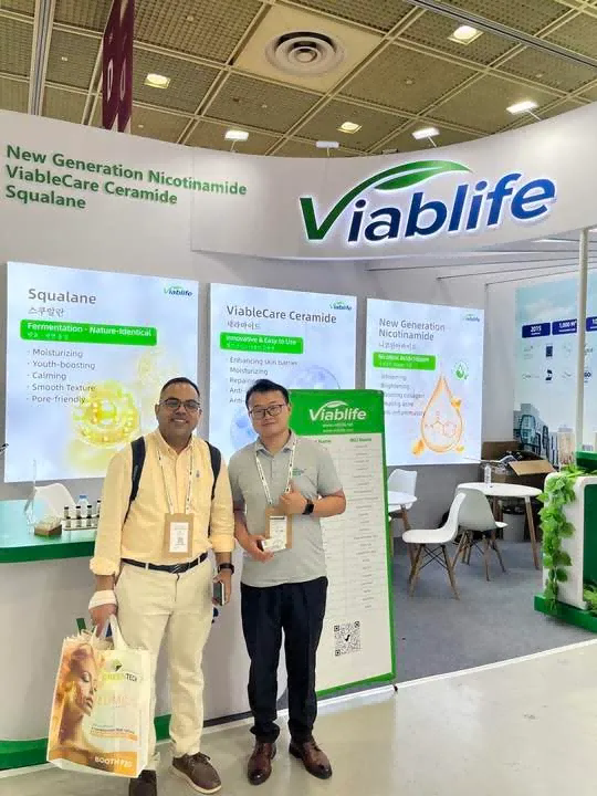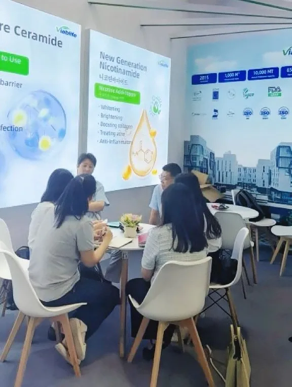 在本次in-cosmetics korea 大会上,唯铂莱携众多创新产品与技术惊艳亮相。其展示的产品涵盖了多个领域,尤其是在生物活性原料方面表现突出,吸引了众多参会者的目光。“有料·好用”神经酰胺系列、新一代烟酰胺、角鲨烷等唯铂莱特色创新原料,依托领先的生物智造技术造就的卓越功效,在大会上备受关注。唯铂莱外贸团队向新老客户详细介绍了唯铂莱产品在皮肤护理领域的特点和优势,为肌肤问题提供了全新的解决方案选择。