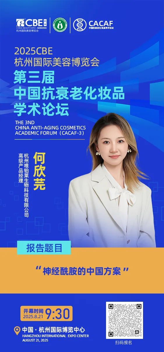 唯铂莱高级产品经理——何欣芫女士将在会上作《神经酰胺的中国方案》主题报告,唯铂莱邀您莅临本次会议,共同探寻抗衰老化妆品新质生产力,探索符合中国国情的抗衰老化妆品之路。