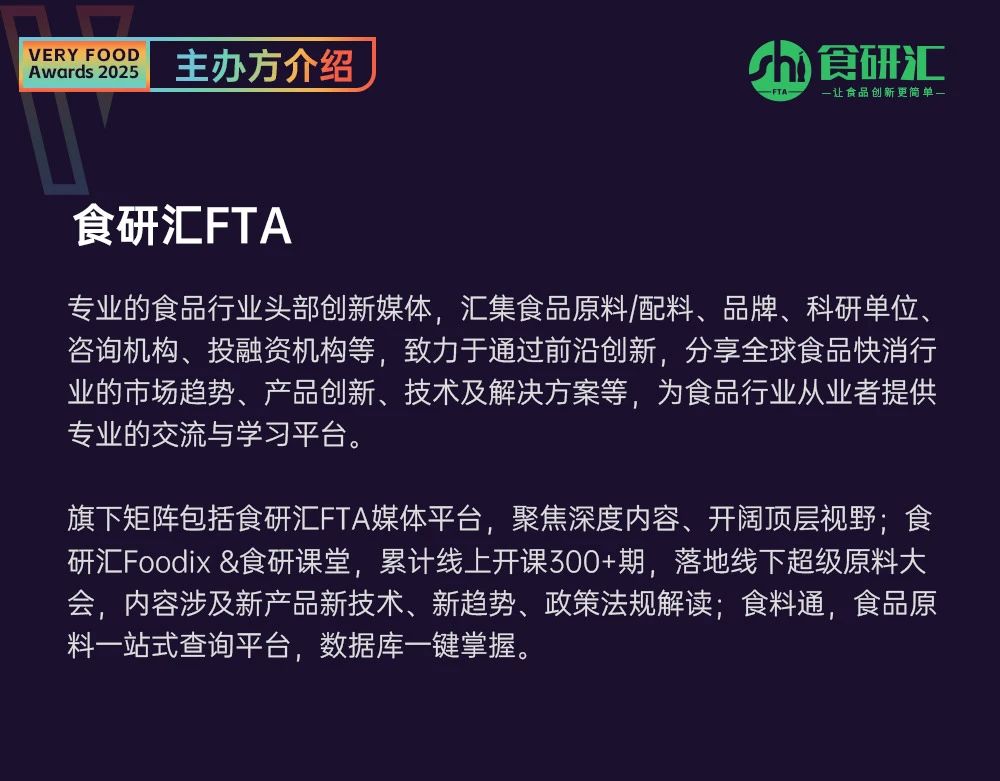 2025年3月12日,由食研汇FTA主办的2025 Very Food创新奖正式官宣启动。本届大赛将通过大赛专家评审团公正评选,对食品行业中做出重大贡献、取得巨大成就的上游原料、终端产品和科研创新成果等等进行表彰。