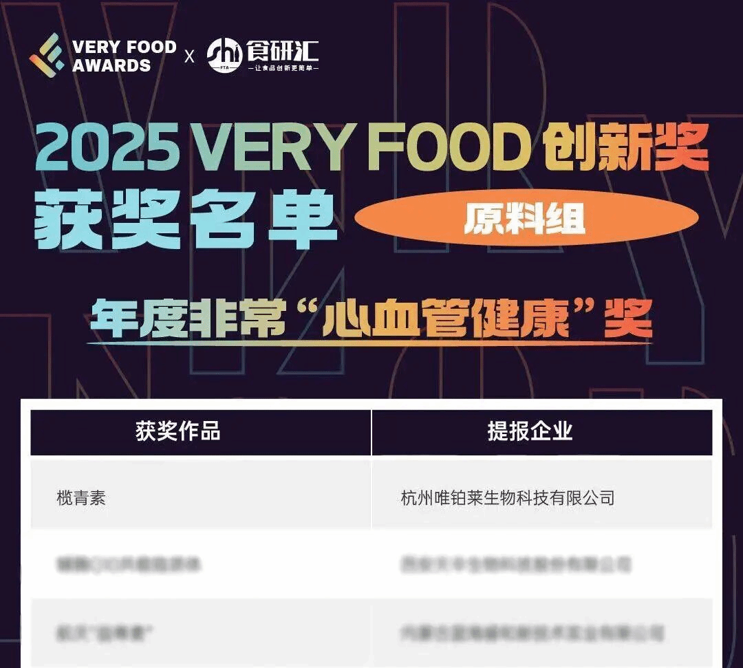 本次大赛经由行业权威专家评审团严格审核、公正评选。唯铂莱创新产品天然超强抗氧化剂——榄青素从68件原料组优秀作品中脱颖而出,成功斩获提名并晋级决赛,最终以天然属性和超强的抗氧化功能赢得评委一致认可,荣获年度非常“心血管健康”奖!