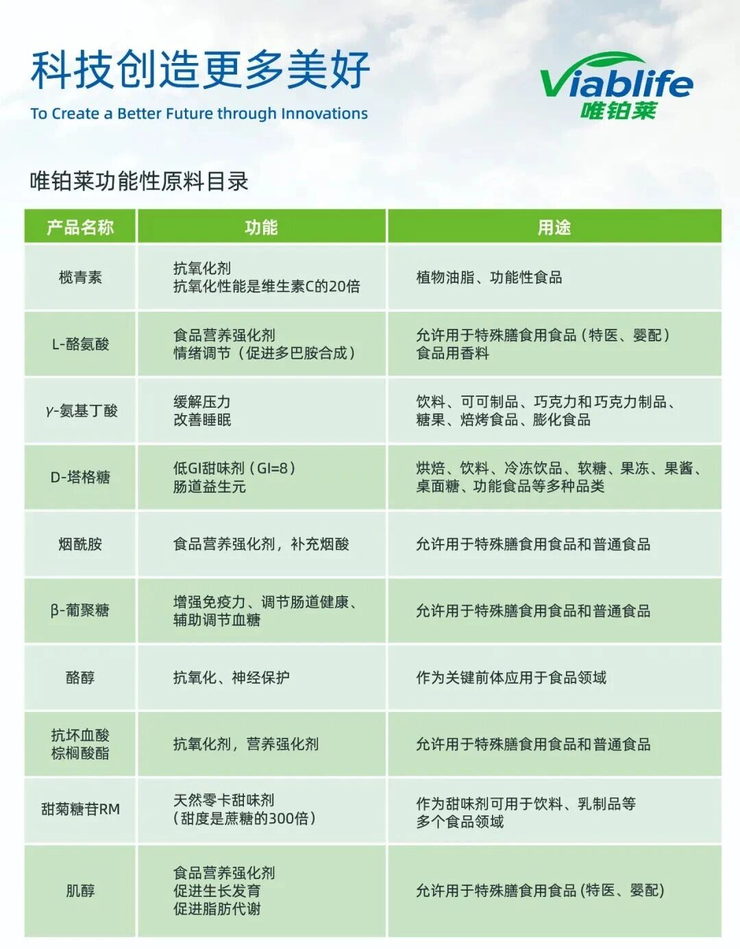 *唯铂莱功能性原料目录声明:我司提供的所有信息均基于我们当前所掌握的知识。尽管如此,我们不对其做任何担保,也不承担任何责任,并且保留在任何时候进行技术变更的权利。