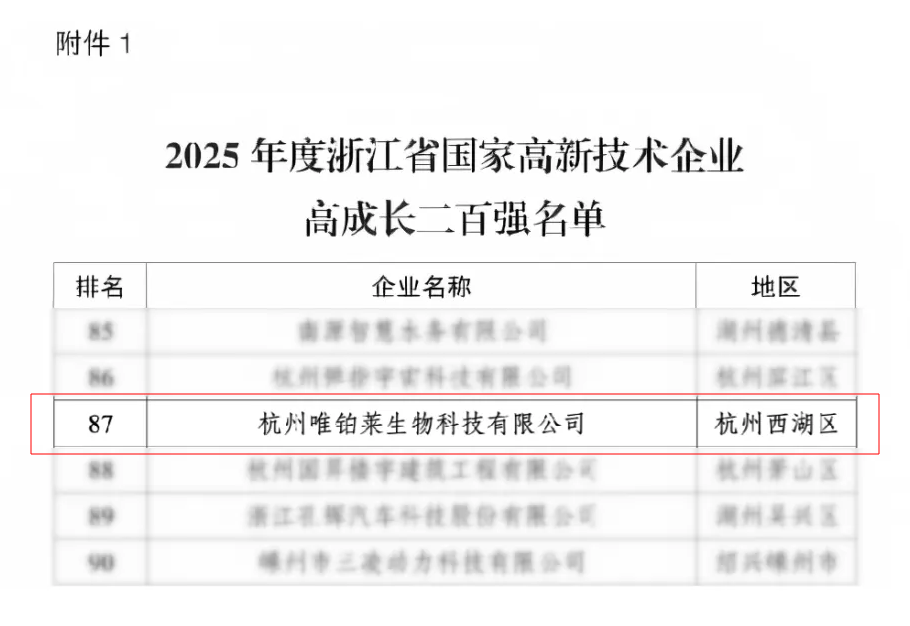 唯铂莱入选《2025年高新技术企业高成长二百强名单》(序列编号87)